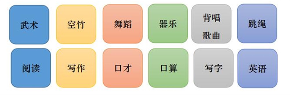 十項(xiàng)考級(jí):寫字、口才、閱讀、國(guó)學(xué)、英語(yǔ)、唱歌、跳舞、樂器、武術(shù)、空竹