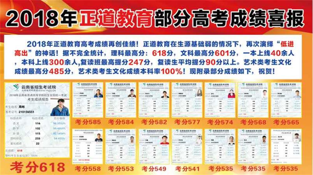 2018年正道教育高考:最高分:618分,一本上線20余人,本科上線300余人;復(fù)讀班最高提分247分,復(fù)讀生平均提分90分以上;藝術(shù)類考生文化成績(jī)最高分納振廷485分,藝術(shù)生文化本科過(guò)線率100%!
